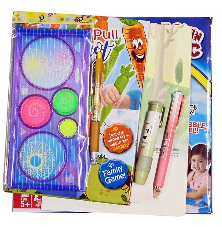 名稱: 禮物包C (2盒盒裝玩具+4-5款文具 ,款式隨機) 編號: BT10643B 售價: HK$100.00/份